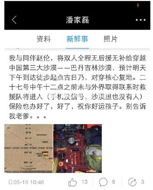 昨天,一则无锡男孩潘家磊失联的消息在微博微信等社交媒体上被热传:“右边的是我弟弟潘家磊,左边是他同学赵伦(见图)。两人于5月17日从古日乃徒步进入巴丹吉林沙漠,进行大穿越,预计27号中午12点前出沙漠,但是到现在没有任何消息。目前已经启动救援预案,救援协调人:马江龙,电话15002575300。”