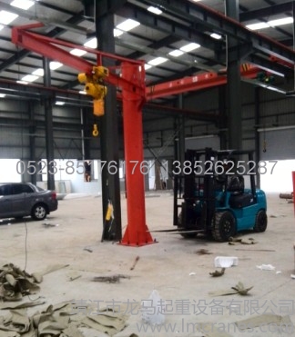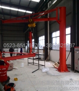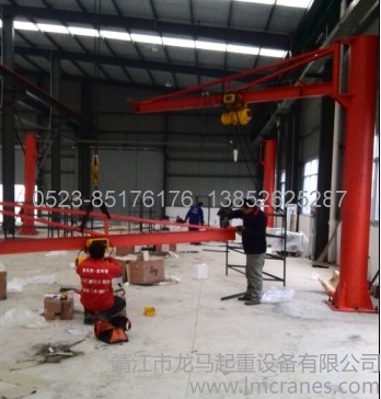 悬臂吊起重机工作强度为轻型,起重机由立柱,回转臂回转驱动装置及电动葫芦组成,立柱下端通过地脚螺栓固定在混凝土基础上,由摆线针轮减速装置来驱动悬臂回转,电动葫芦在悬臂工字钢上作左右直线运行,并起吊重物。起重机旋臂为空心型钢结构,自重轻,跨度大,起重量大,经济耐用。内置式行走机构,采用带滚动轴承的特种工程塑料走轮,摩擦力小,行走轻快;结构尺寸小,特别有利于提高吊钩行程。