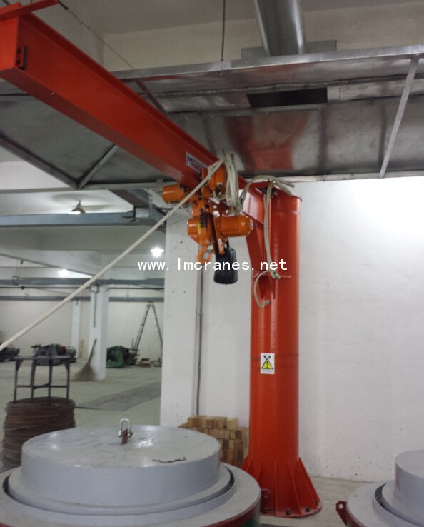 此台悬臂吊应用在东台一家钛丝拉丝厂里,由于现场有厂房高度的影响,上面还有抽风通风装置,所以留给悬臂吊的空间很小,所以我们采用下支撑的悬臂吊结构方式,电动葫芦采用MORIS摩锐牌的低净空的环链电动葫芦,正好可以满足起吊要求。